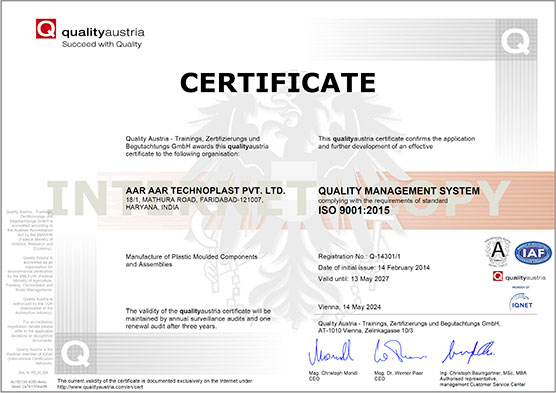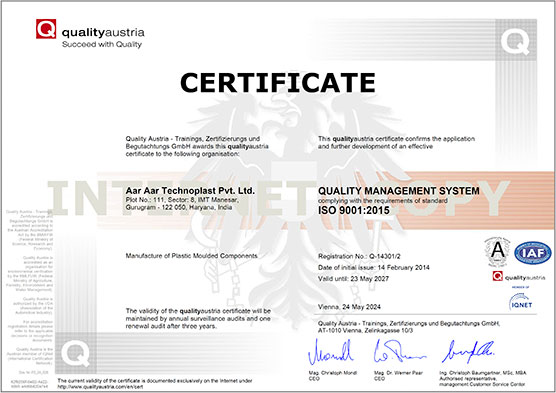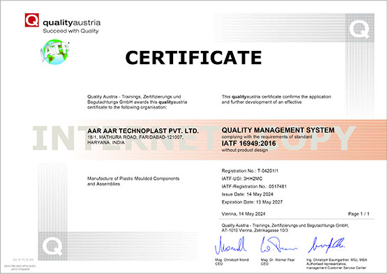 Aar Aar is IATF 16949:2016, ISO 9001:2015, ISO 14001: 2015, ISO 45001:2018 certified.