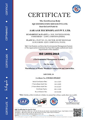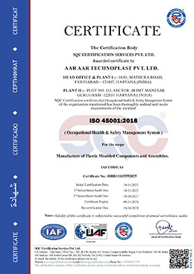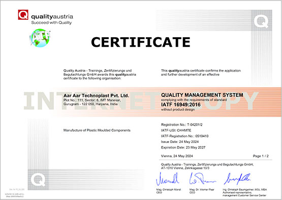 Aar Aar is IATF 16949:2016, ISO 9001:2015, ISO 14001: 2015, ISO 45001:2018 certified.